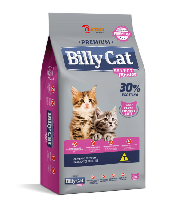 Billy Cat Select Filhotes e um alimento completo e balanceado, com ingredientes de alta digestibilidade, trazendo em sua composição todos os nutrientes indispensáveis para o desenvolvimento do seu filhote. Billy Cat Select Filhotes possui níveis adequados de gorduras, DHA, proteínas, vitaminas, fibras, minerais, adição de taurina (aminoácido essencial à dieta), teor de magnésio equilibrado e componentes que equilibram o PH da urina, prevenindo contra a obstrução do trato urinário.