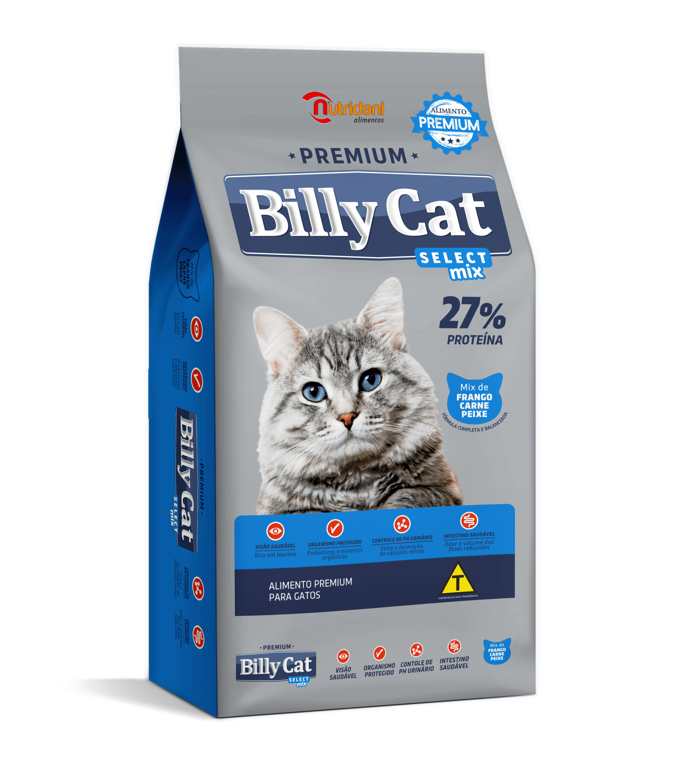 Billy Cat Select Mix e um alimento completo e balanceado, com ingredientes de alta digestibilidade, trazendo em sua composição todos os nutrientes indispensáveis para o desenvolvimento do seu gato. Billy Cat Select Mix possui níveis adequados de gorduras, proteínas, vitaminas, fibras, minerais, adição de taurina (aminoácido essencial à dieta), teor de magnésio equilibrado e componentes que equilibram o PH da urina, prevenindo contra a obstrução do trato urinário.