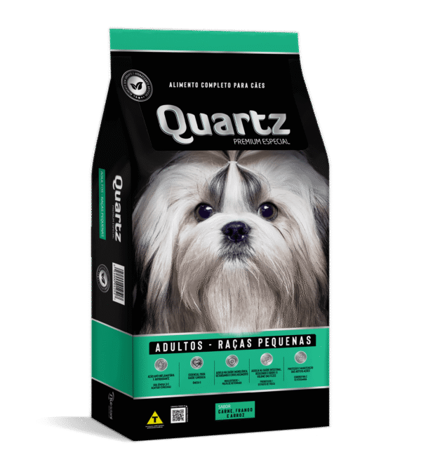 Quartz Adultos Raças Pequenas é um alimento premium especial com 24 % de proteínas. Sua fórmula é elaborada com matérias-primas selecionadas e de ótima qualidade. Possui em sua formulação DHA (Ômega 3) e Açafrão (Cúrcuma), Nucleotídeos + Polpa de Beterraba, Prebiótico , Extrato de Yucca, Ômega 6, Condroitina e Glucosamina, tudo para garantir um produto que atenda às necessidades do animal mantendo a saúde perfeita.