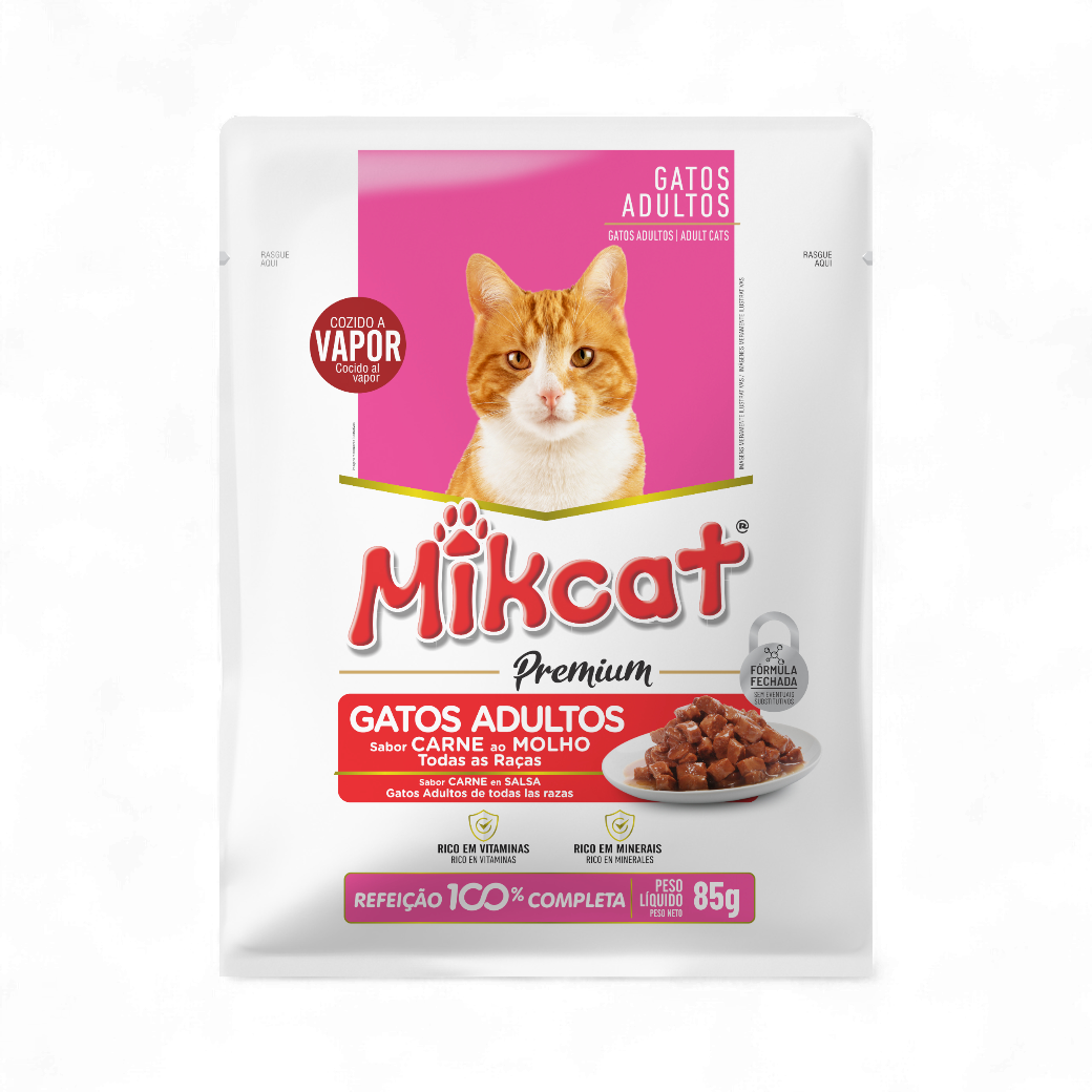 Com porções no tamanho ideal, o sachê para gatos Mikcat Carne ao molho garante uma refeição completa e balanceada para o seu gato. O alimento para felinos adultos de todas as raças é rico em vitaminas e minerais e possui fórmula fechada, sem substitutivos. É desenvolvida com ingredientes de qualidade e que são cozidos a vapor, processo que deixa o sachê Mikcat ainda mais saboroso.