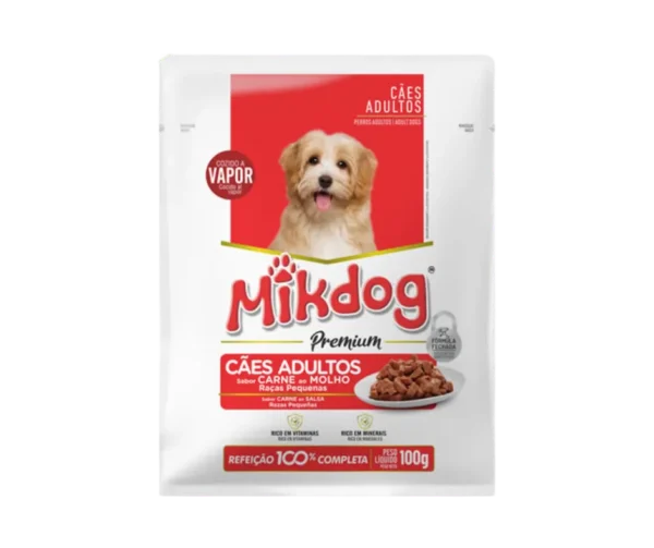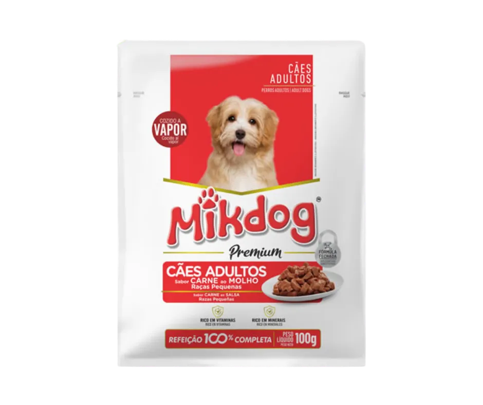 Formulado especialmente para cães de raças pequenas, o sachê Mikdog Raças Pequenas sabor carne ao molho está disponível em pequenas porções, com tamanho ideal para uma refeição diária completa e balanceada. O alimento, que não possui substitutivos, é composto por ingredientes cozidos a vapor, que realçam o sabor, mantém a qualidade e são mais saudáveis. Os sachês de Mikdog Raças Pequenas também são ricos em nutrientes, como vitaminas e minerais, essenciais para cães na fase adulta.