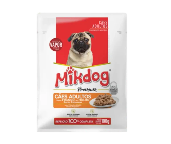 Elaborado com ingredientes cozidos a vapor, o sachê para cães adultos Mikdog realça o sabor clássico do frango ao molho e ajuda a manter a dieta do seu pet equilibrada. Além disso, sua fórmula é fechada, ou seja, não tem eventuais substitutivos e é rica em minerais e vitaminas como D3 e K3 que auxiliam na formação óssea e no desenvolvimento muscular. Cada sachê de Mikdog é uma refeição 100% completa para seu cão!